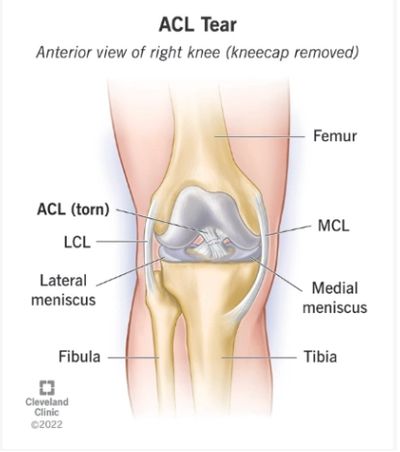 The ACL works like a strong band that connects your thigh bone (femur) to the shin bone (tibia) and keeps your knee from bending or twisting too far, especially in the anterior direction. When too much force pushes the knee beyond its normal range, the ACL can tear.