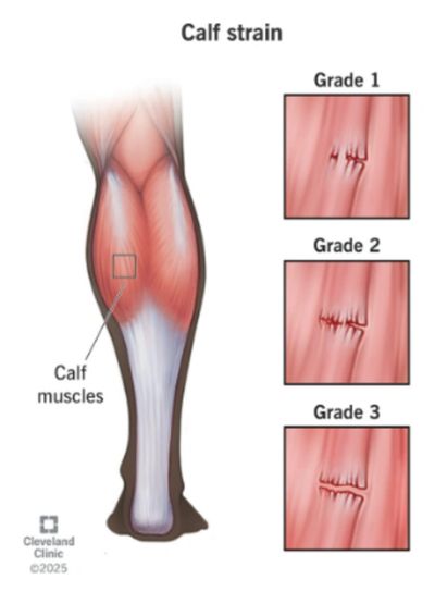 A calf strain occurs when a muscle in the back of the lower leg is over-stretched or torn. Severity can vary depending on how much the muscle was stretched, from a small overstretch (mild) to a severe one (full tear).