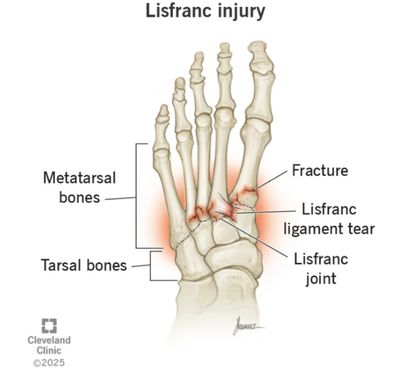 A Lisfranc injury involves damage to the joint complex in the midfoot, specifically where the metatarsals meets the tarsal bones. The injury can include ligament sprains, fractures, or dislocations. Lisfranc ligaments help stabilize the joint complex, therefore injuries to these ligaments can cause the midfoot to become unstable.