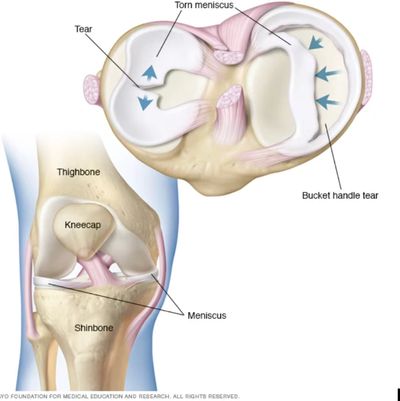 The meniscus is a C-shaped piece of cartilage that cushions the space between your thigh bone (femur) and shin bone (tibia). A sudden twist of the knee as it is carrying weight can cause of tear in the meniscus.