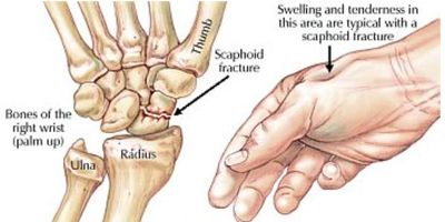 Scaphoid fractures are wrist injuries where the small bone near the base of the thumb breaks. It is the most common fracture of the carpal (wrist) bones. Severity may range from small cracks that only need a splint to displaced or open fractures that need surgery.