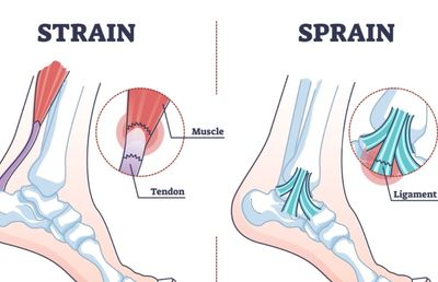 A sprain is an injury to a ligament, which connects bone to bone, while a strain is an injury to a muscle or tendon, which connects muscle to bone